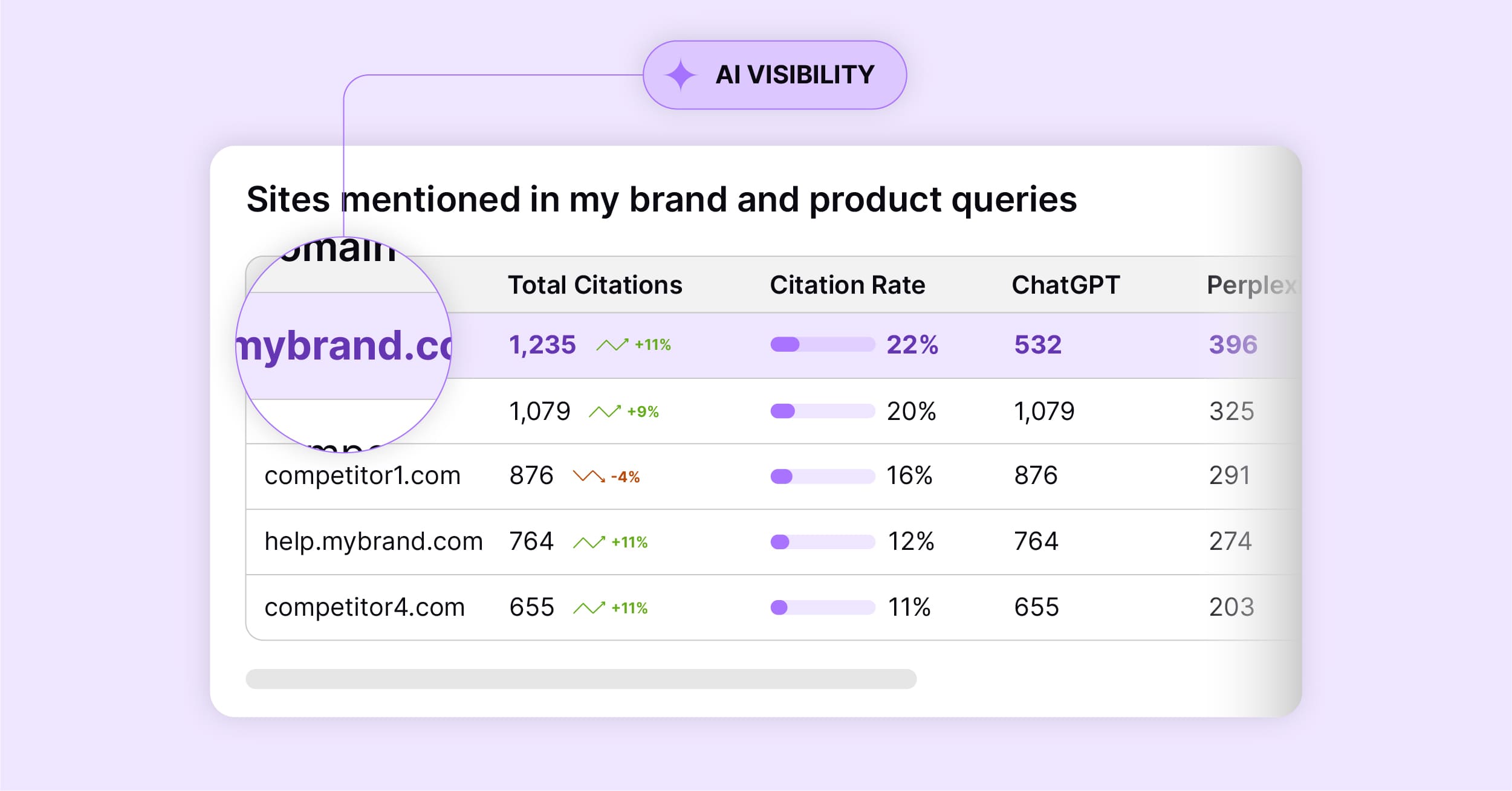 Track how often your brand is mentioned and your domain is cited across ChatGPT, Google AI Mode, Perplexity, and soon Google AI Overviews and Gemini, which are the platforms that represent the majority of today's AI search market.