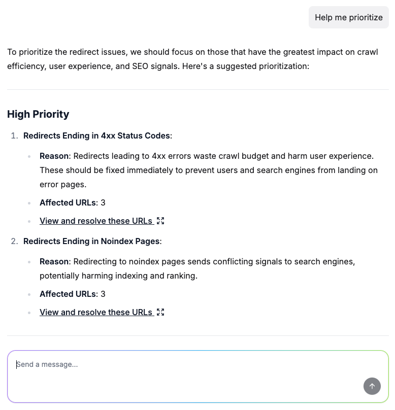 Par exemple, pour construire une stratégie de maillage interne, il suffit de demander : « Quelles pages internes devrais-je lier avec [ce nouvel article] ? » et vous obtenez immédiatement une liste de pages pertinentes à intégrer dans vos nouveaux ou anciens contenus.