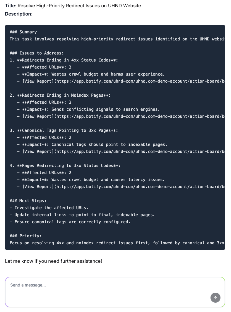 Avec Botify Assist, confiez cette tâche à l’IA : « Peux-tu créer un ticket JIRA pour [un insight] ? »