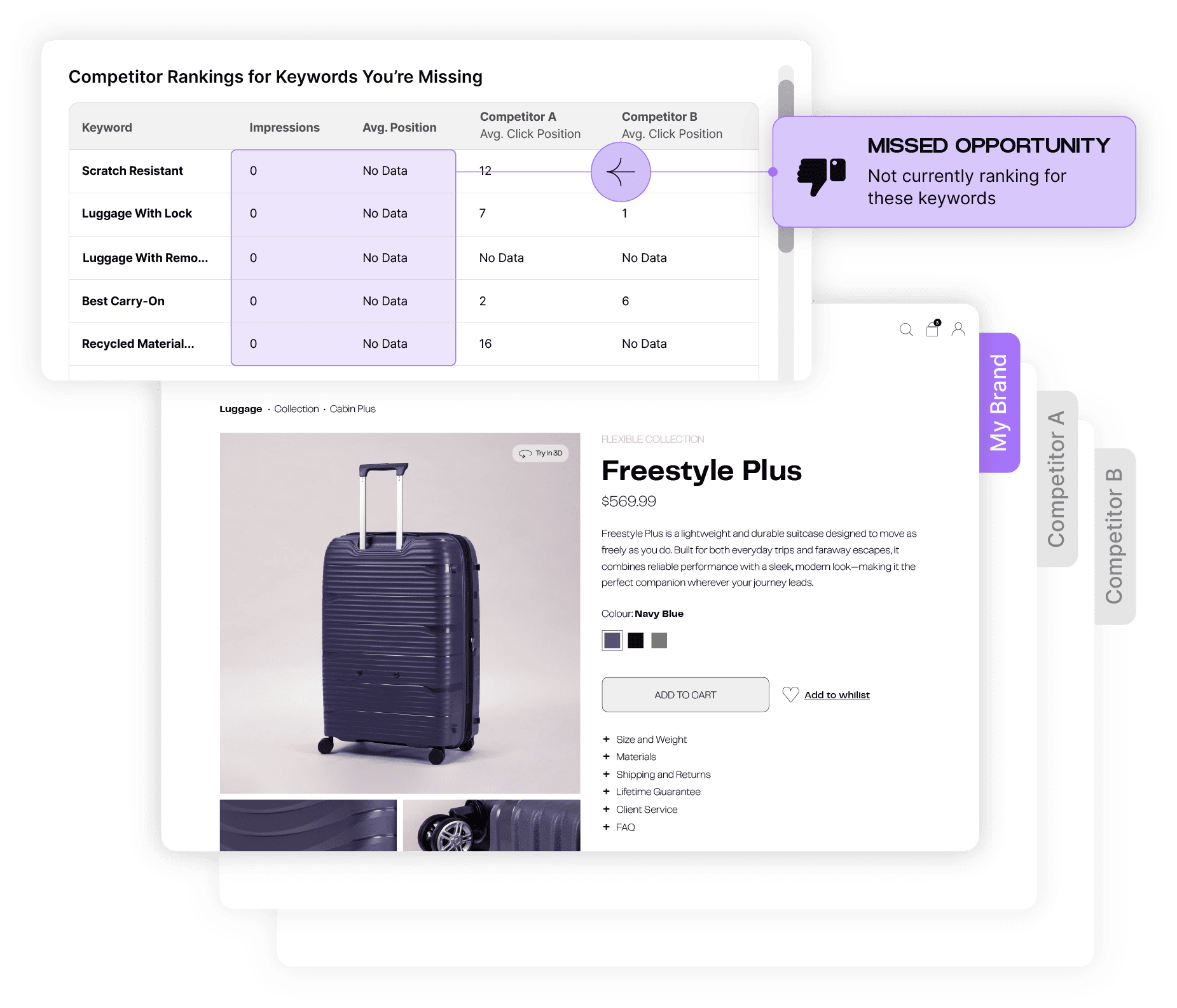 With built-in third-party integration, RealKeywords shows you where competitors rank for keywords you’re missing. Identify gaps in your category coverage or where you’re losing ground, and prioritize content that can make up the difference.