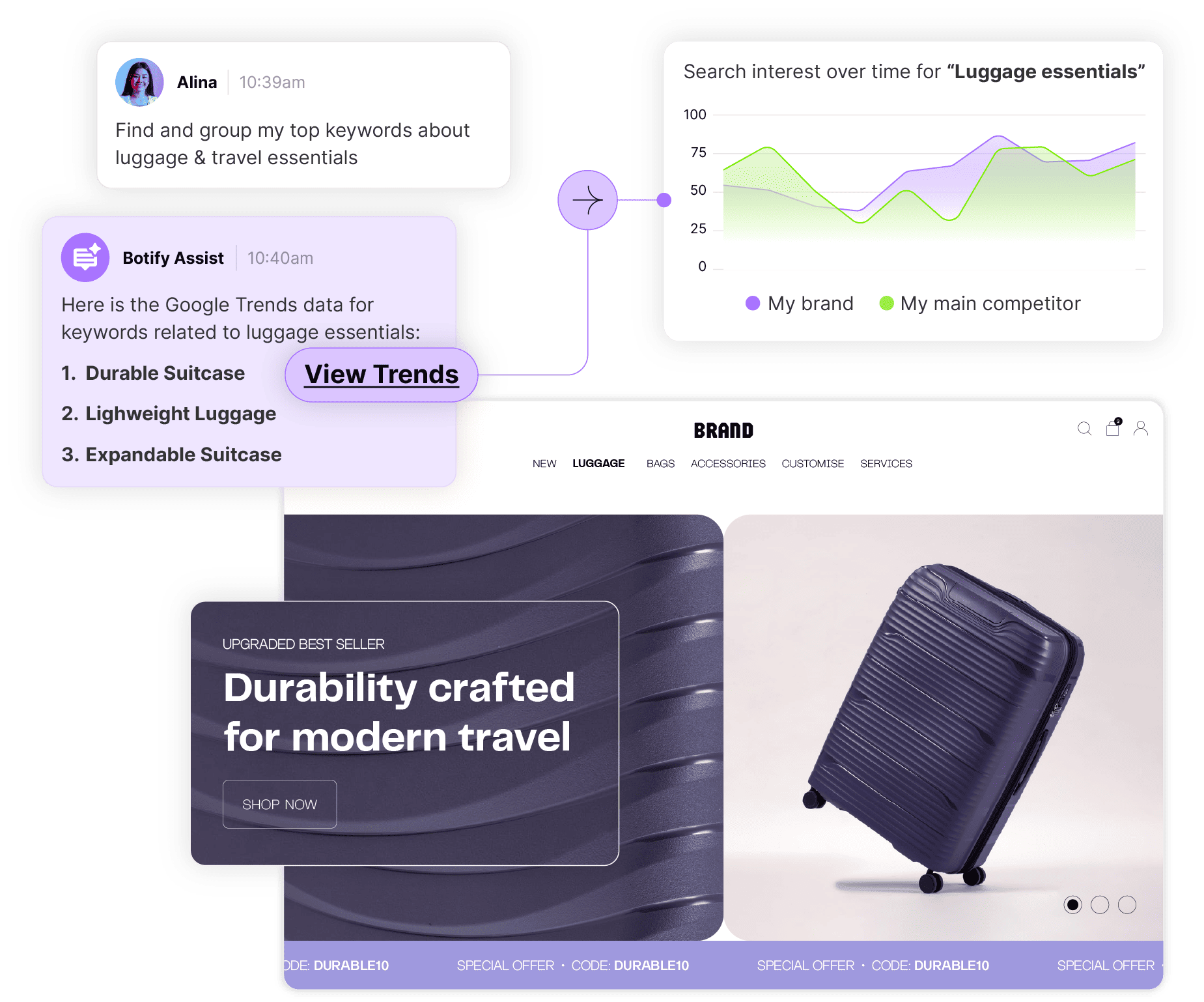 Pair RealKeywords data with Botify Assist, your AI-powered copilot. Ask questions in natural language and surface insights in seconds, turning keyword intelligence into optimized content within one platform.