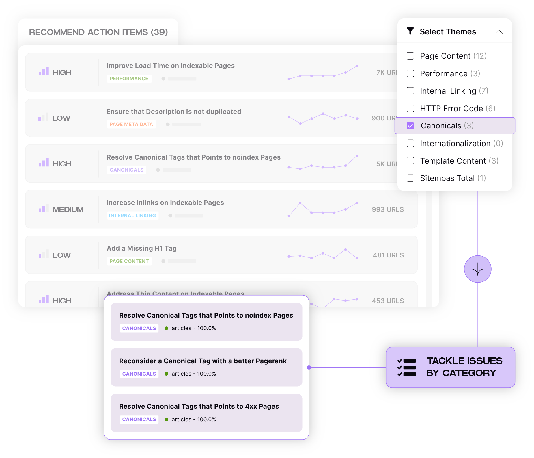 Group related actions into themes to make it easier to plan sprints and assign work across teams. Plus, this helps you tackle entire categories of issues — like all internal linking improvements or canonical tag fixes — in one pass.