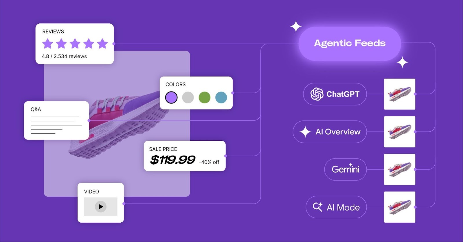- Help AI agents find and recommend their products, with feeds automatically built and enriched with reviews, Q&As, and other contextual data AI agents need.