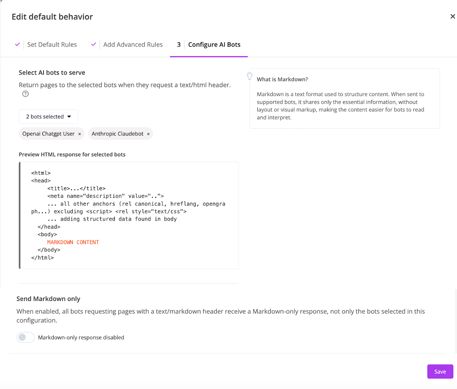 As we learn more about how AI bots operate, it’s clear that clean, simple content is the easiest for them to understand and process. We’ve introduced the option to serve a Markdown version of your pages to AI bots via SpeedWorkers to help maximize the chances that they will quickly access, understand, and summarize content accurately.